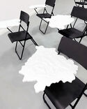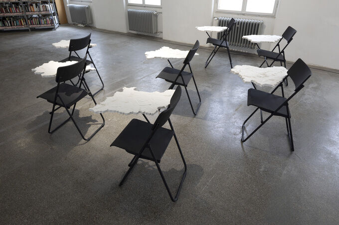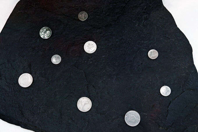 Nachdem ich eine Arbeit von mir – den Abguss einer Steinplatte mit Fossilien, auf der Münzen und Knopfzellen (Batterien) angeordnet sind – auf Instagram gepostet hatte, schrieb mich unser belarussischer Freund Uladzimir Hramovich an. Er zeigte mir online eine Arbeit, die er 2021 in Georgien gemacht hatte und die ihn an meine Arbeit erinnerte. Mehr noch, sie ähnelte ihr sogar ziemlich: eine Schieferplatte in der Form einer Malerpalette, auf der Münzen lagen. Er brachte sein Objekt außerdem in unmittelbarem Zusammenhang mit einer Grafik meiner Partnerin Ekaterina Shapiro-Obermair, die seiner Arbeit auf eine andere, unheimliche Weise glich: Sie zeigte die schwarze Silhouette einer Malerpalette. In diesem Moment wirkten für mich plötzlich diese drei Arbeiten wie Plateaus, die Verbindungen zueinander suchten.